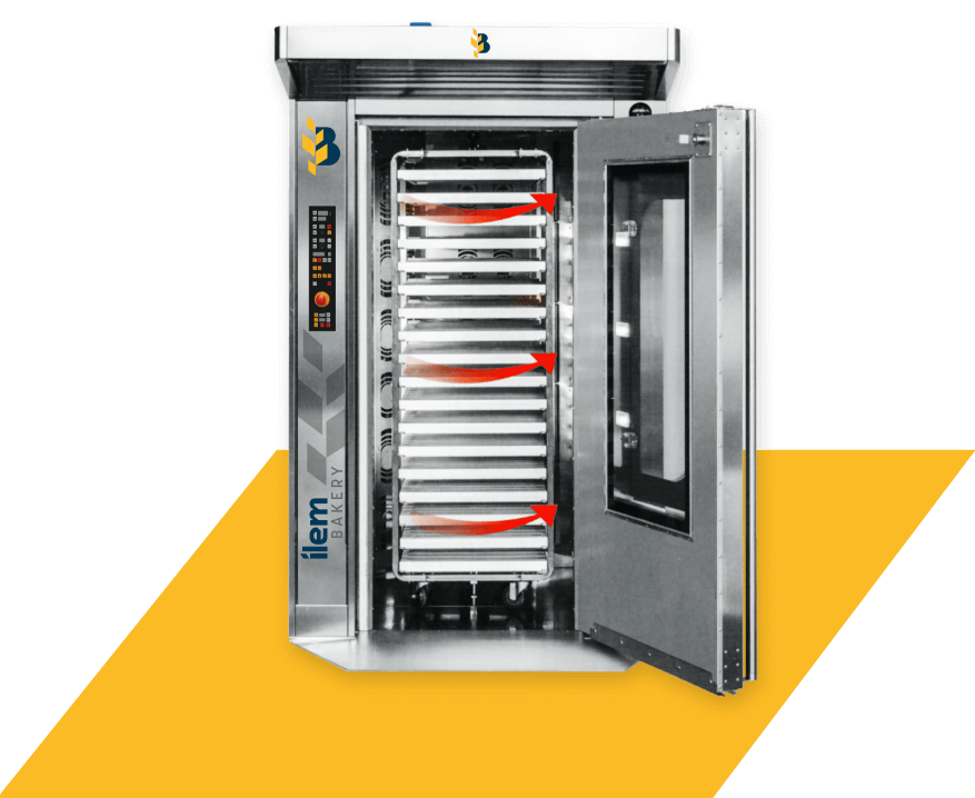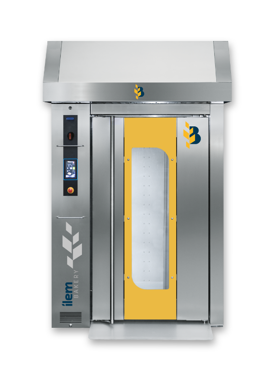 Forni rotor a una camera contenenti uno o più carrelli avvolti da un flusso d’aria calda, adatti alla cottura di qualsiasi prodotto di pane e pasticceria.